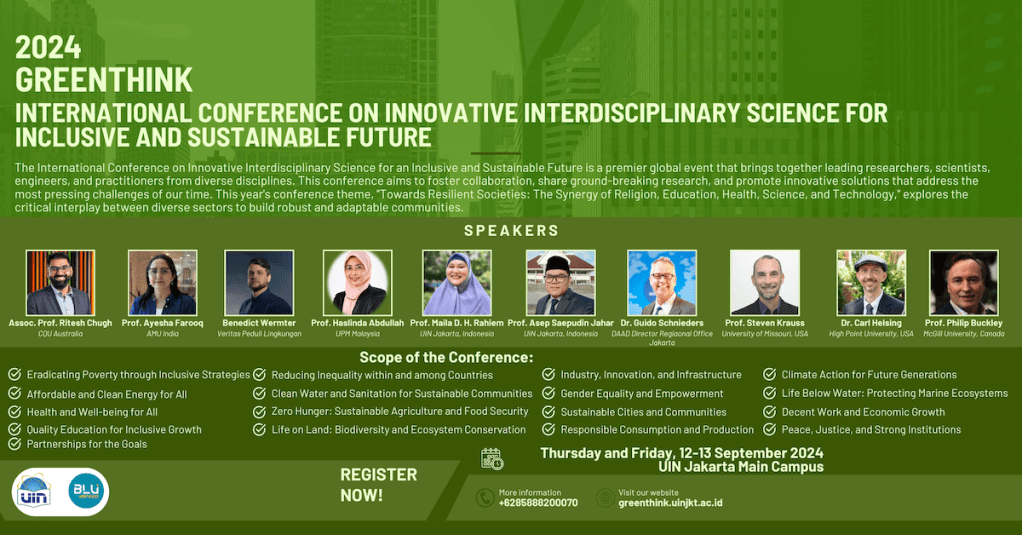 GreenThink 2024: International Conference on Innovative Interdisciplinary Science for Inclusive and Sustainable Future https://greenthink.uinjkt.ac.id/en